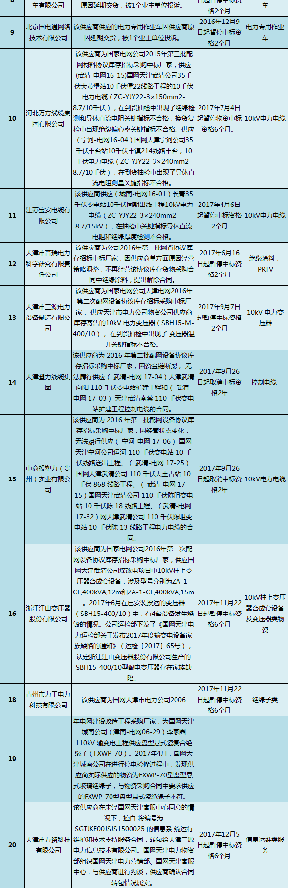 國(guó)網(wǎng)(天津)通報(bào)的供應(yīng)商不良行為處理情況(2017.12)