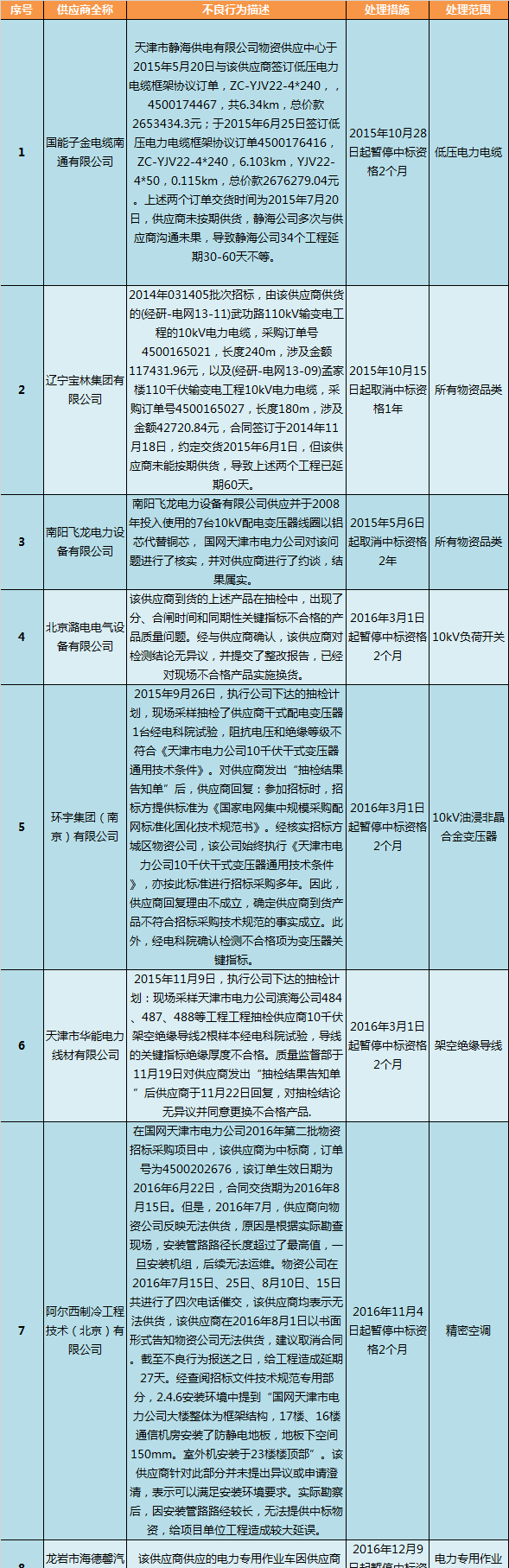 國(guó)網(wǎng)天津市電力公司關(guān)于供應(yīng)商不良行為處理情況的通報(bào)