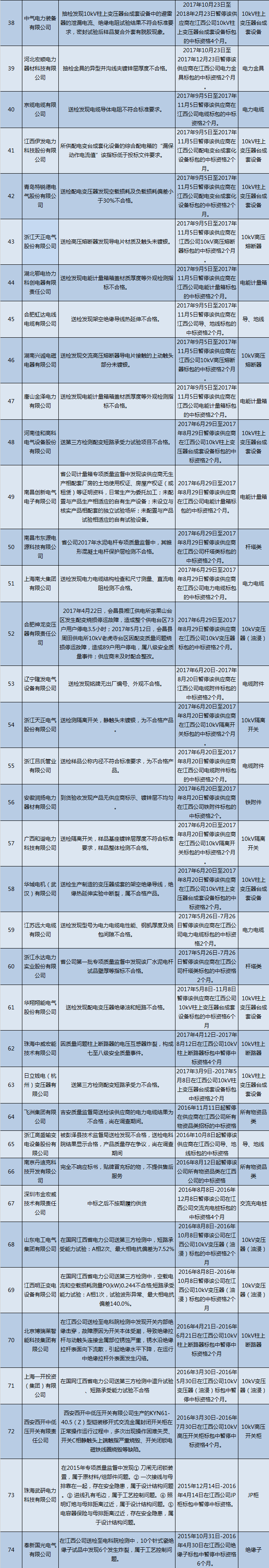 為督促供應(yīng)商誠(chéng)信履約、保證產(chǎn)品質(zhì)量、確保電網(wǎng)建設(shè)順利進(jìn)行及安全可靠供電,依據(jù)《國(guó)家電網(wǎng)公司供應(yīng)商不良行為處理管理細(xì)則》的有關(guān)規(guī)定,對(duì)出現(xiàn)產(chǎn)品質(zhì)量問題、履約不誠(chéng)信等問題的供應(yīng)商進(jìn)行了處理。具體如下: