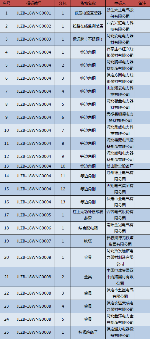國網(wǎng)吉林省電力有限公司2018年物資協(xié)議庫存招標(biāo)采購中標(biāo)公告(招標(biāo)編號:JLZB-18WNG0001-0009)