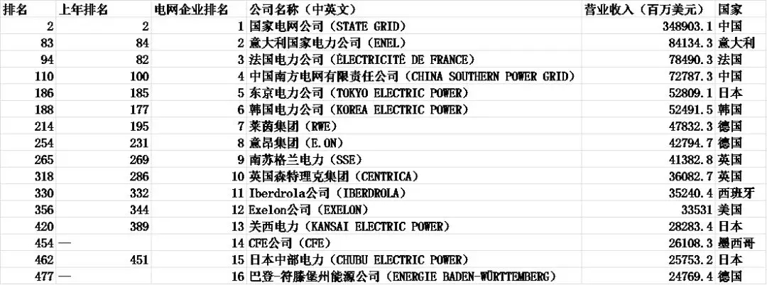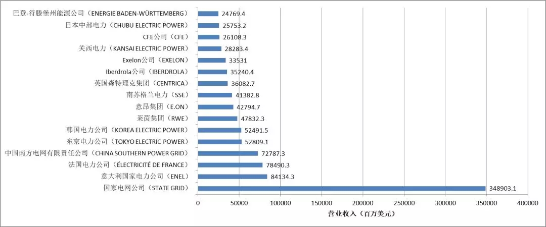 全世界共有16家主營業(yè)務(wù)涉及電網(wǎng)的企業(yè)上榜。電網(wǎng)企業(yè)中,國家電網(wǎng)以348903.1百萬美元的營業(yè)收入高居第一,且總收入是第二名意大利電力的四倍以上,在總榜單中與去年保持一致,名列第二。南方電網(wǎng)以72787.3百萬美元的收入排名第四,在總榜單中與去年相比下降十名,名列第一百一十名。