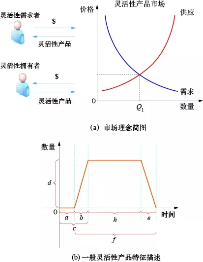 圖4中的(a)、(b)兩圖分別給出了靈活性市場的核心理念和針對一般靈活性產(chǎn)品的特征描述。供需雙方需要首先確定靈活性商品的一般特征參數(shù),如功率范圍、響應(yīng)速度和時長等。在產(chǎn)品特征描述達(dá)成共識的前提下,靈活性需求者和靈活性擁有者在基于供求理論的市場中分別對其所買/所賣的靈活商品進(jìn)行控制、管理、定價和交易。在靈活性的控制和管理上,各種直接和間接的控制手段都可以用來控制獨立的靈活性資源或者基于聚合方式(aggregation)的大量靈活性資源。